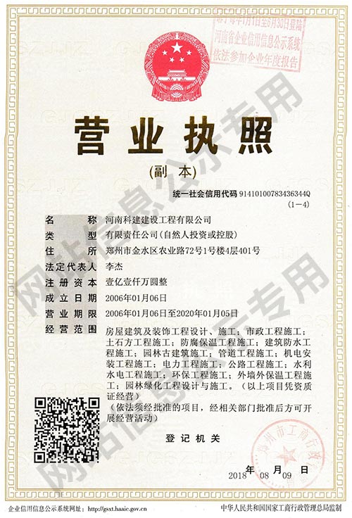 河南科建建設工程有限公司是一家以房屋建筑、建筑裝飾、建材貿(mào)易及大型建筑機械設備租賃為主營業(yè)務的成長型企業(yè)。擁有建筑工程總承包壹級資質,裝飾裝修、防水防腐保溫等專業(yè)承包壹級資質,注冊資本1.1億元。